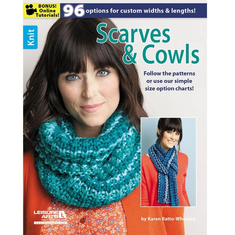 Leisure Arts Knit Scarves & Cowls Book- 96 options for custom widths and lengths. Complete instructions are provided for making the 12 photographed models. To give you more options, the easy-to-follow charts have already done the math for lots more sizes. Change up each design by choosing yarns with different textures, novelty effects, or using solid versus variegated colors. Creating a scarf or cowl that is exactly what you want has never been easier. Made using a variety of yarn weights, the six designs include: ribbed, pebbles, cables, clover, half linen, and zig zag. 32 pages in a softcover.